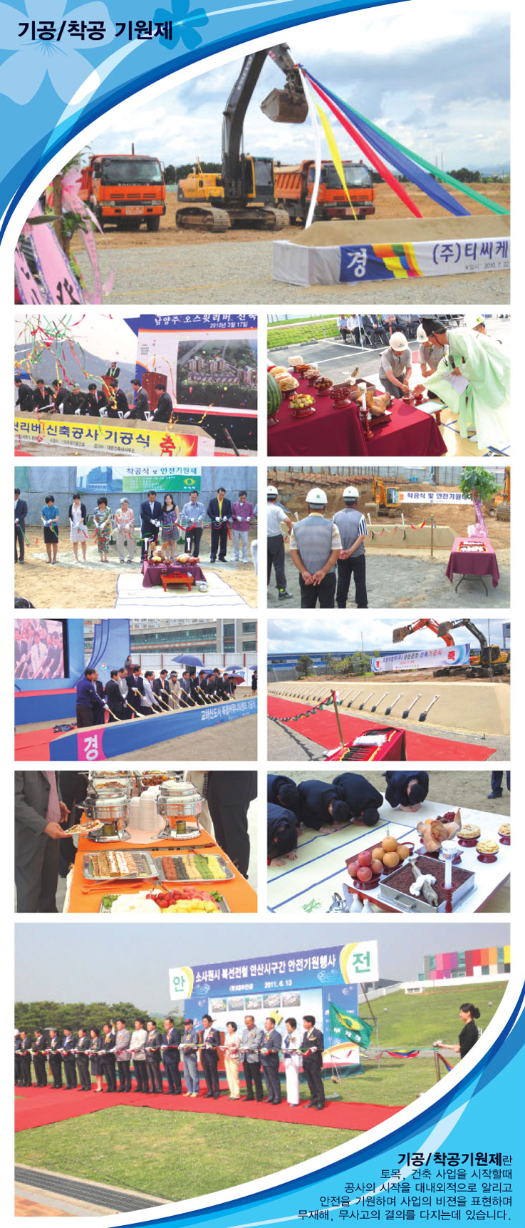 기공/착공기원제란 토목, 건축 사업을 시작할때 공사의 시작을 대내외적으로 알리고 안전을 기원하며 사업의 비젼을 표현하며 무재해, 무사고의 결의를 다지는데 있습니다.