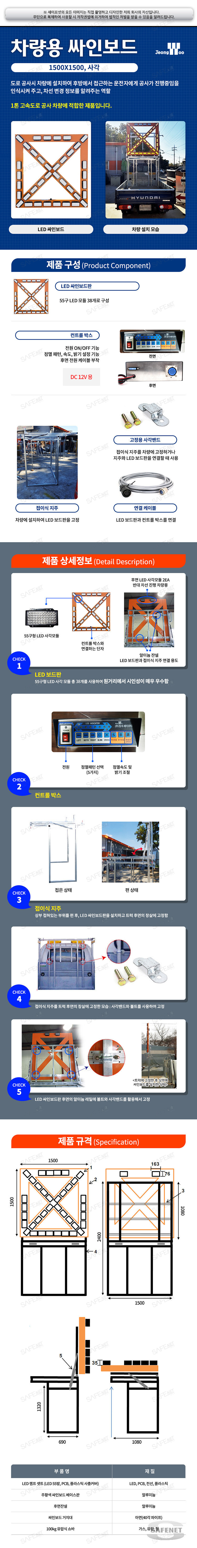 규격 1500 X 1500mm / 55구 LED 사각모듈 38개로 구성 / DC12V / 1톤 차량용