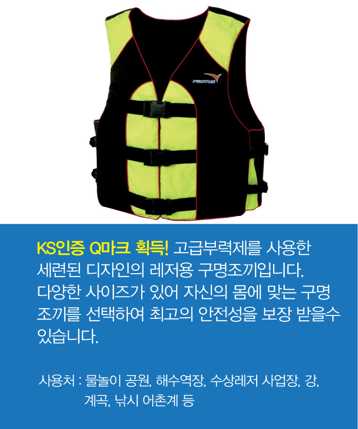 KS인증 Q마크 획득! 고급부력제를 사용한 세련된 디자인의 레저용 구명조끼입니다.