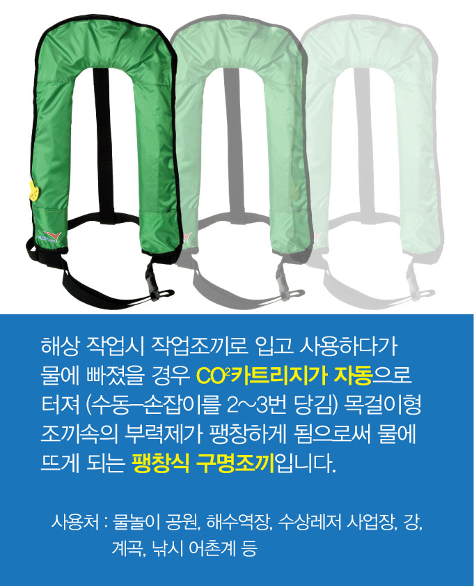 해상 작업시 작업조끼로 입고 사용하다가 물에 빠졌을 경우 CO2카트리지가 자동으로 터져 (수동-손잡이를 2~3번 당김) 목걸이형 조끼속의 부력제가 팽창하게 됨으로써 물에 뜨게 되는 팽창식 구명조끼입니다.