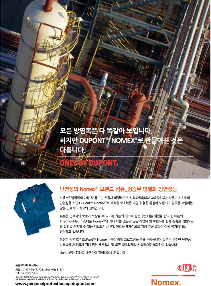 노멕스? 방염복의 가장 첫 용도는 조종사 비행복으로 시작되었습니다. 40년이 지난 지금도 스스로의 난연성을 지닌 듀폰 Nomex? 로 제작된 보호복은 매일 위험한 환경에 노출되어 업무를 수행하는 많은 근로자의 최고의 선택입니다.