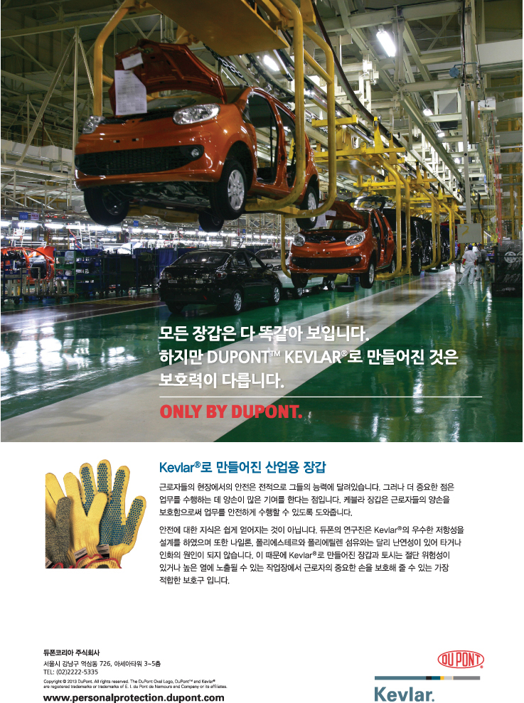 안전에 대한 지식은 쉽게 얻어지는 것이 아닙니다. 듀폰의 연구진은 Kevlar?의 우수한 저항성을 설계를 하였으며 또한 나일론, 폴리에스테르와 폴리에틸렌 섬유와는 달리 난연성이 있어 타거나 인화의 원인이 되지 않습니다. 이 때문에 Kevlar?로 만들어진 장갑과 토시는 절단 위험성이 있거나 높은 열에 노출될 수 있는 작업장에서 근로자의 중요한 손을 보호해 줄 수 있는 가장 적합한 보호구 입니다.