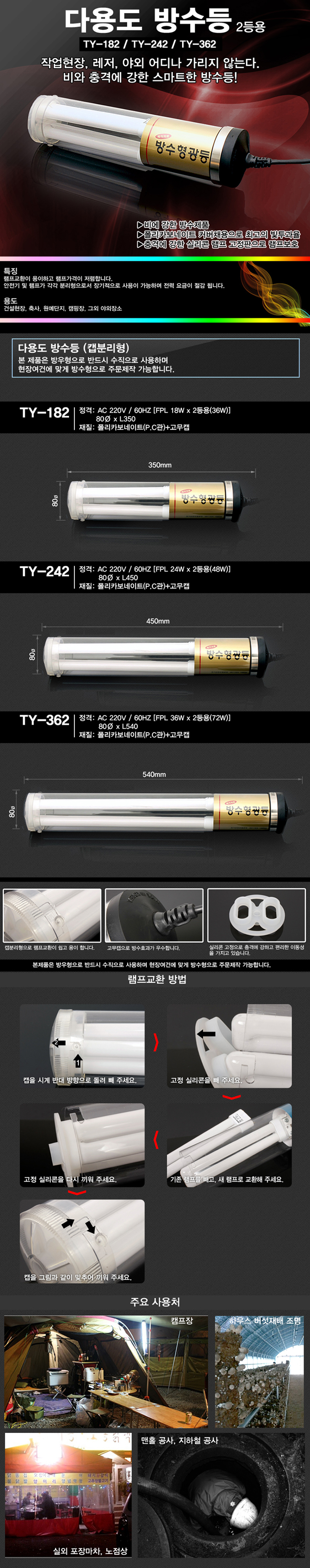 - 건설 가설전등으로 많이 쓰이며 레저활동 등 야외장소에도 아주 적합하다.
