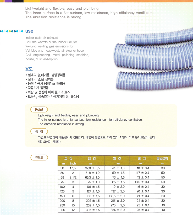 가볍고 유연하여 배관공사가 간편하다. 내면이 평면으로 되어있어 저항이 적고 통기효율이 높다. 내마모성이 강하다.