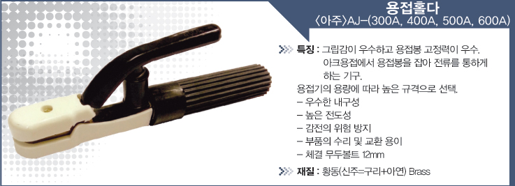 특징 : 그립감이 우수하고 용접봉 고정력이 우수. 아크용접에서 용접봉을 잡아 전류를 통하게 하는 기구.
