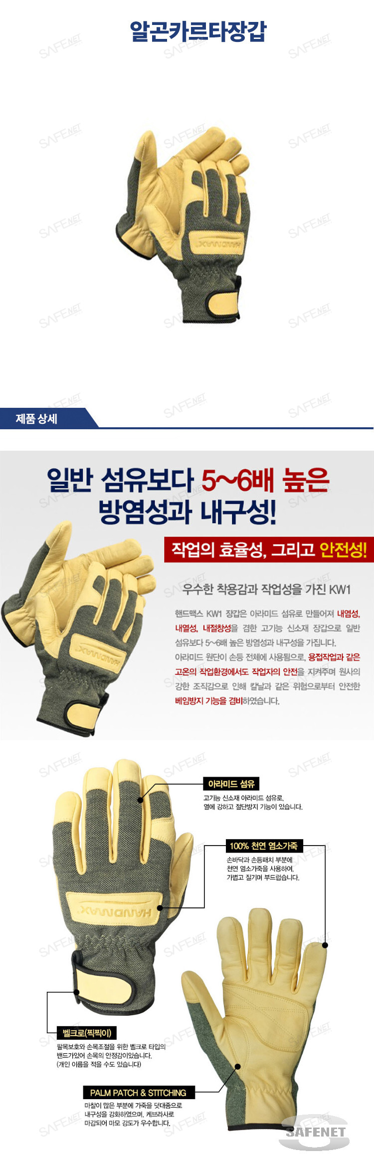 앞판 스티치부분 케브라사로 마감되어 마모강도 우수. 라스타 고강도 아라미드섬유를 복합. 내염, 내열, 내절창성을 겸한