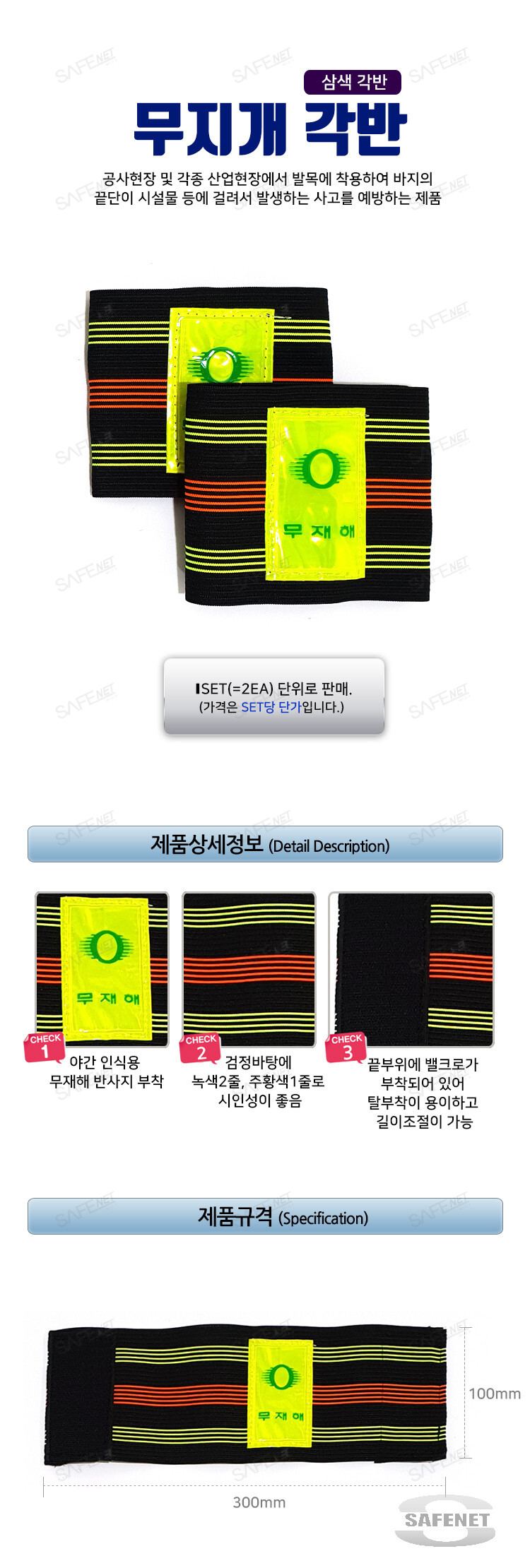 * 일반 밴드각반보다 부드럽고 두꺼운 재질 * 검정바탕 / 녹색2줄 / 주황색1줄 * 대형반사지 (5X8 cm)가 부착되어 야간 시인성이 좋음