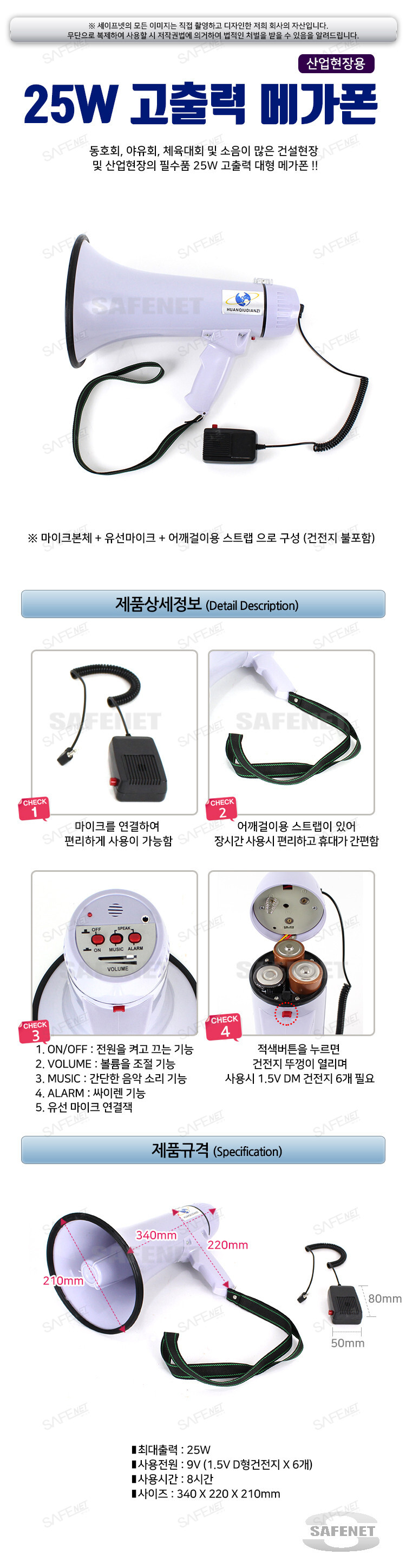 25W,분리형마이크포함,1.5V D형건전지 6개,싸이렌기능 |