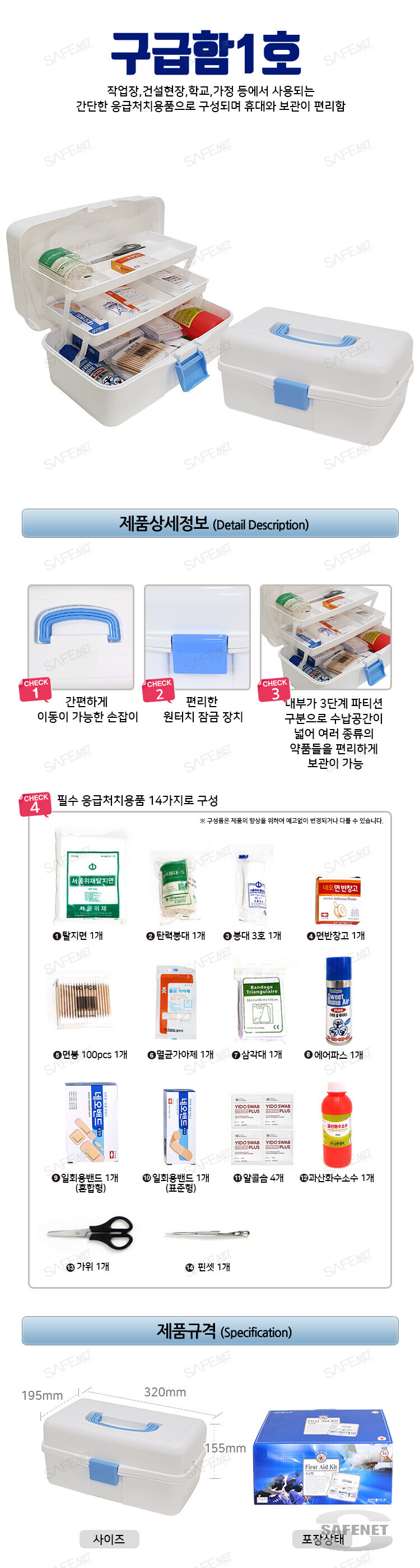 사이즈 : 320*190*155 약 품 : 파스 / 소독약 / 밴드 등 14가지