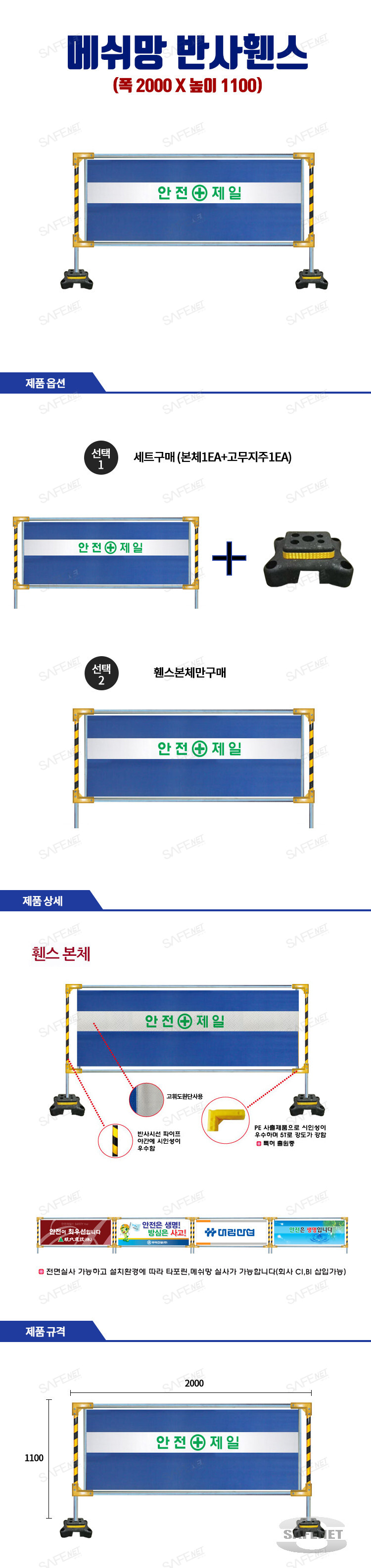 규격 H1100 X W2000mm / 청색메쉬망 / 반사띠 / 안전제일인쇄 / 사각시멘지주