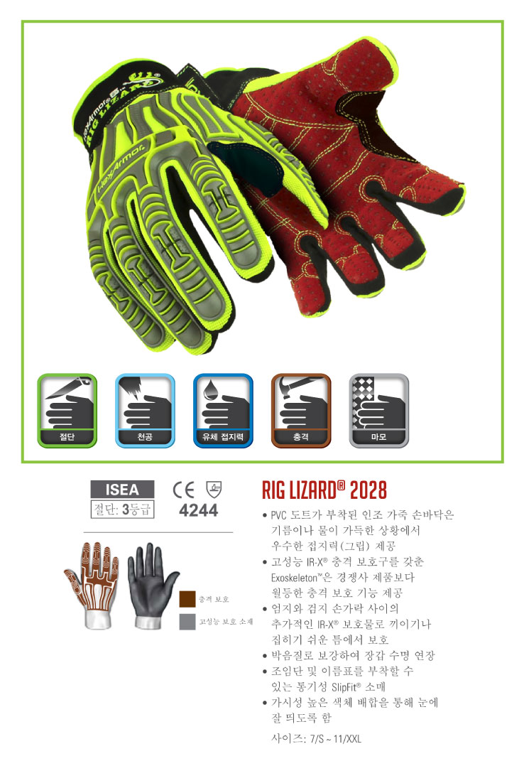 • PVC 도트가 부착된 인조 가죽 손바닥은 기름이나 물이 가득한 상황에서 우수한 접지력(그립) 제공