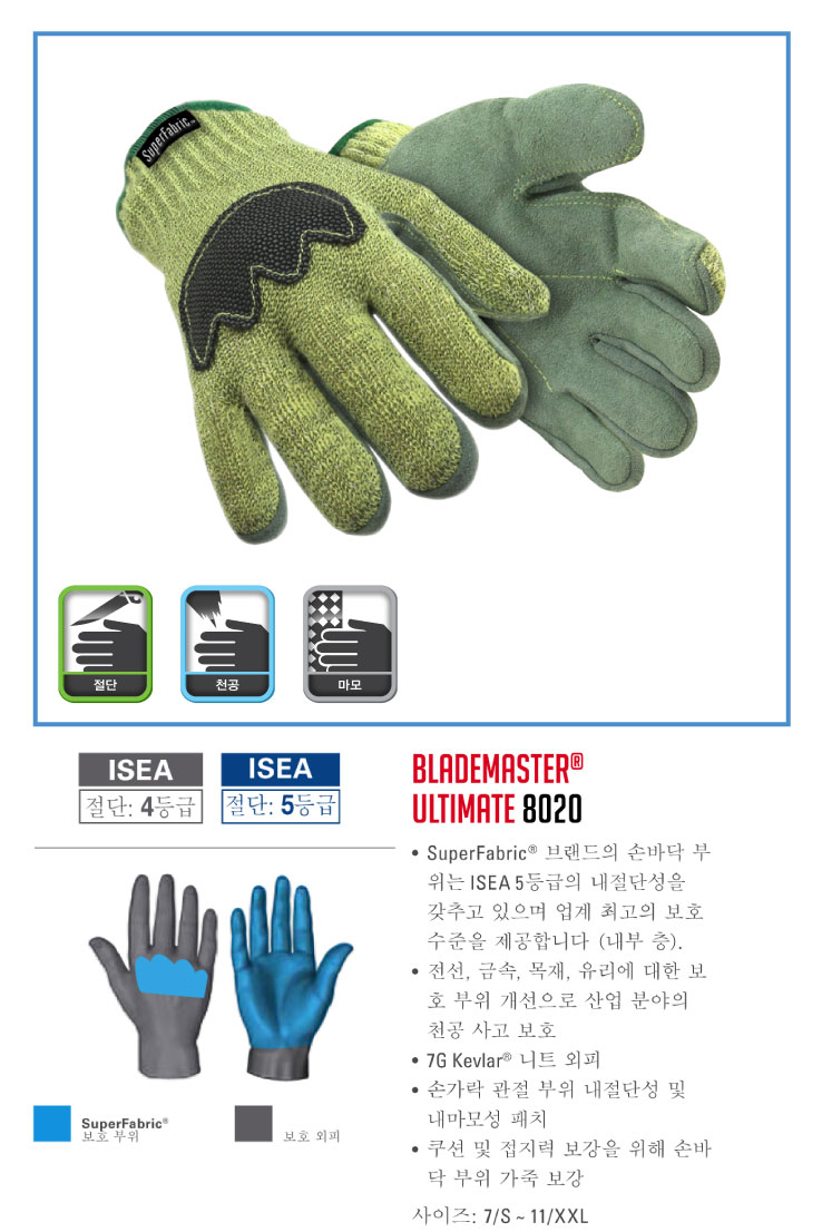 • SuperFabric? 브랜드의 손바닥 부위는 ISEA 5등급의 내절단성을 갖추고 있으며 업계 최고의 보호수준을 제공합니다 (내부 층).