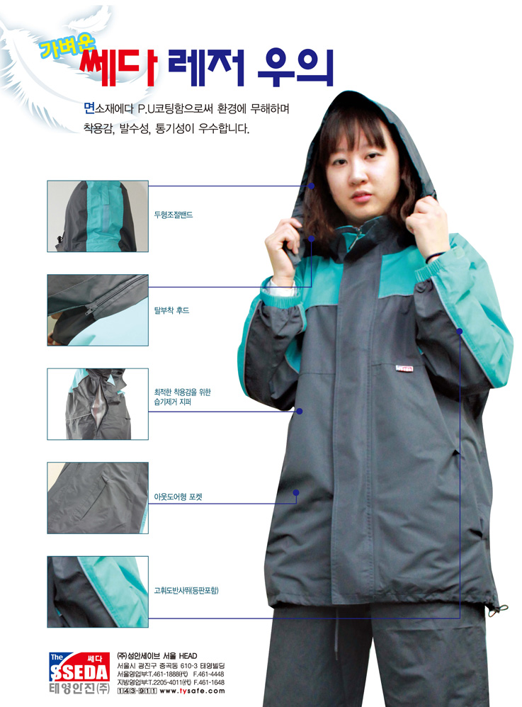면소재에다 P.U코팅함으로써 환경에 무해하며 착용감, 발수성, 통기성이 우수하다.