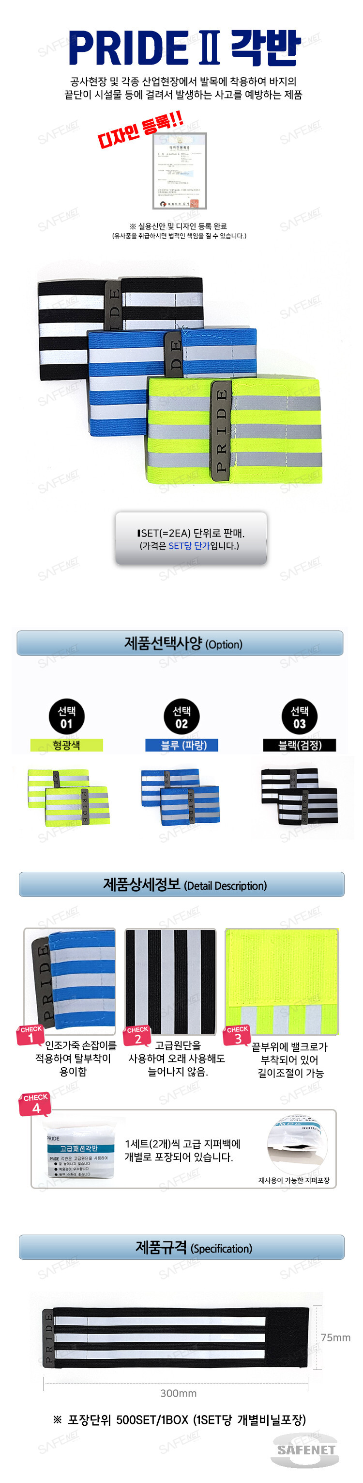 애니원 프라이드각반Ⅱ 사이즈 : 75 X 300 (mm) 색상 : 검정, 형광, 파랑 특징 : 1SET 당 2EA씩 지퍼백포장 고급원단을 사용하여 오래 사용해도 늘어나지 않음. 착용감이 좋고, 디자인이 우수하고 세련된 느낌 회색 반사띠가 3줄이 부착되어있어 야간에 시인성이 좋음. 디자인 등록완료