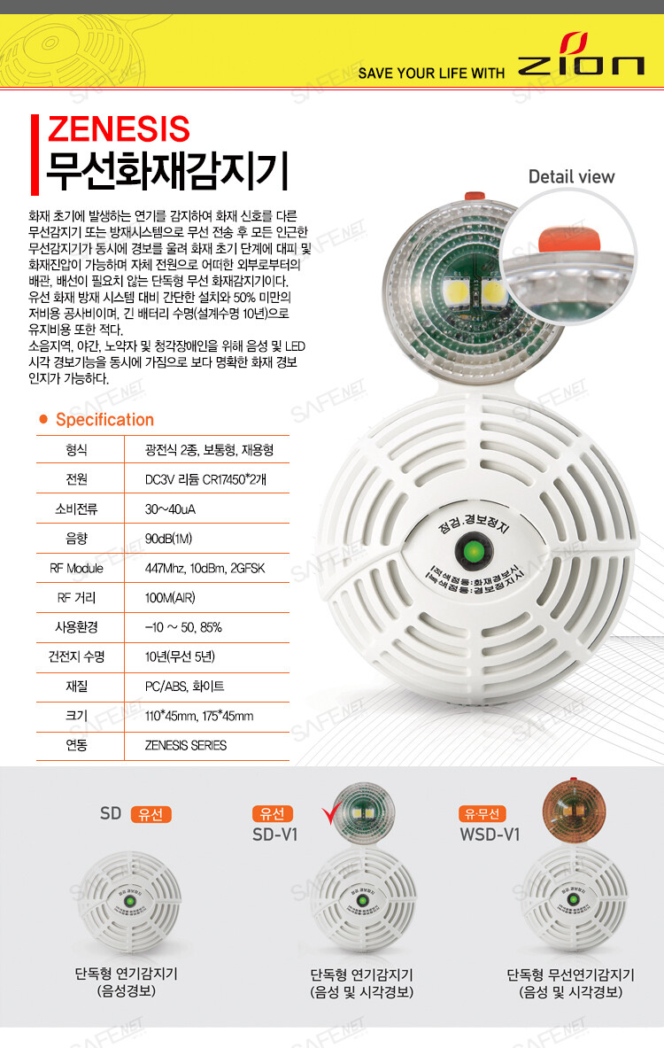 무선화재감지기 (Wireless Smoke Detector) ZENESIS 무선 화재 감지기는 화재 경보 시스템을 구성을 위해 더 이상의 케이블이나 노동력이 필요치 않다. RF 신뢰성에 위해 분리된 RF 모듈은 화재 센서로 부터 입력된 화재 신호를 다른 ZENESIS 무선 시스템으로 무선 전송하고, 그룹에 설치된 모든 무선 감지기가 동시에 알람을 울려, 거주자들의 신속한 대피 및 화재 초기 단계에서 화재 진압이 가능하다. 저전력 회로 설계로 자체 내장된 리듐 건전지로 긴 수명을 보장하며 Mesh Network 통신 시스템으로 어떠한 무선 디바이스에 통신장애가 있어도 다른 디바이스를 이용하여 알람 연동이 가능하며 편리한 확장성과 기존 소방방재 시스템과의 호환성을 경제적으로 구성이 가능하다. 또 소음지역, 야간, 노약자 및 청각 장애우를 위해 음성 알람은 물론이고 시각알람 기능을 동시에 가짐으로써 화재시 보다 명확히 화재 알람 인지가 가능하다.