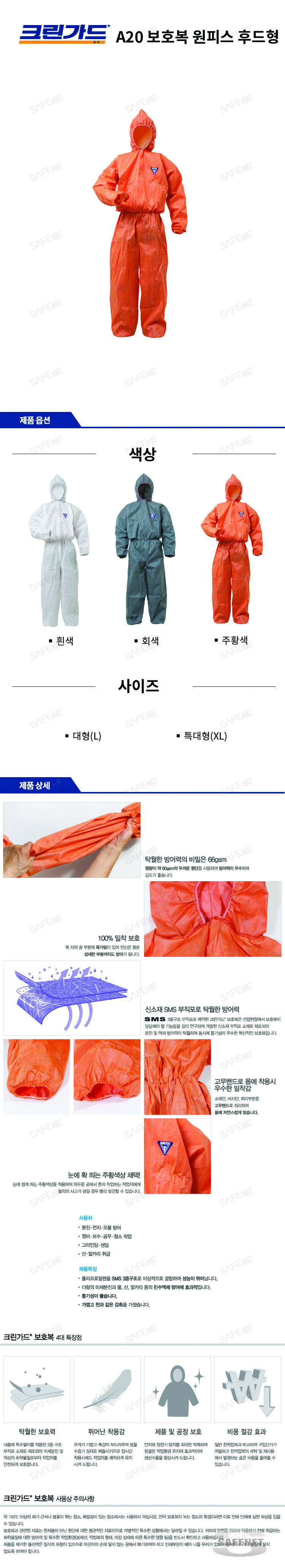 규격 흰색,회색,주황색 / 부직포 장섬유와 단섬유를 결합한 삼중구조원단 / 원피스후드형 / L,XL / 박스당 24벌 / 안전보건공단 전신보호복 5형식 인증 / 미세분진 및 친수성액체방어용 / 에어로졸 형태의 분진작업장