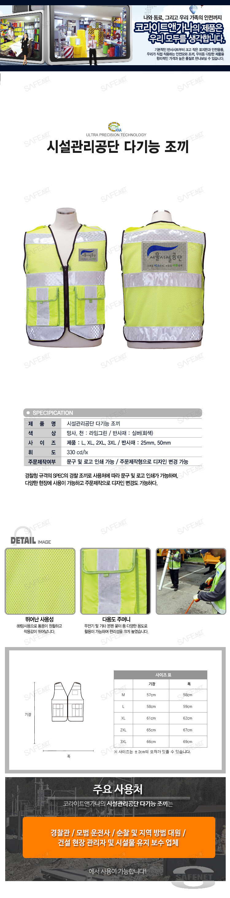 코라이트앤가나의 시설관리공단 다기능 조끼는 경찰청 규격의 SPEC의 경찰조끼로 사용처에 따라 문구 및 로고인쇄가 가능하며, 다양한 현장에 사용이 가능하고 주문제작으로 디자인 변경도 가능합니다.