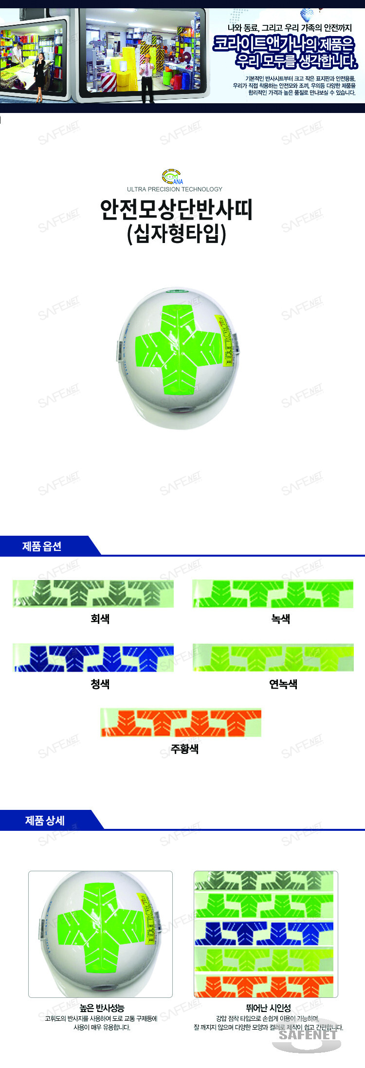 코라이트 앤 가나의 안전모 상단 띠는 고휘도의 반사지를 사용하여 도로 교통 구제등에 사용이 매우 유용합니다.