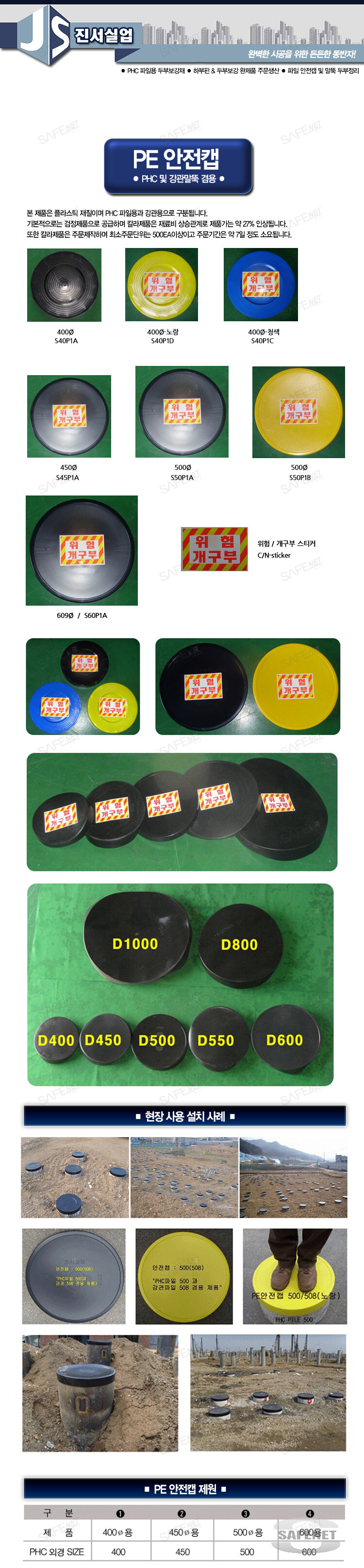 진서실업의 PE안전캡은 플라스틱 재질이며 PHC 파일용과 강관용으로 구분됩니다.