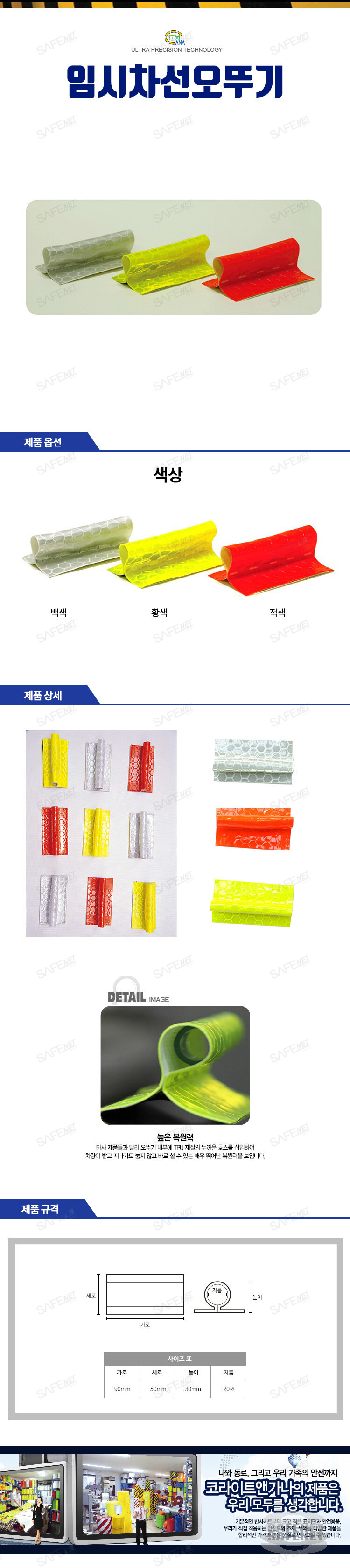 코라이트 앤 가나의 차선오뚜기는 타사 제품들과 달리 오뚜기 내부에 TPU 재질의 두꺼운 호스를 삽입하여 차량이 밟고 지나가도 눕지 않고 바로 설수 있는 매우 뛰어난 복원력을 보입니다.