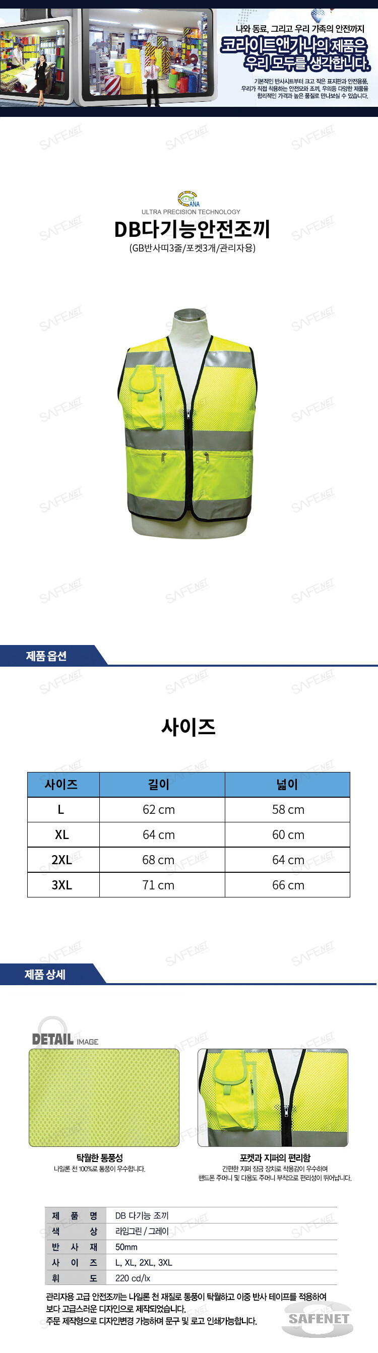 규격 형광색 / 천+망사원단 / GB반사띠3줄 / 다용도포켓3개 / 고급관리자형