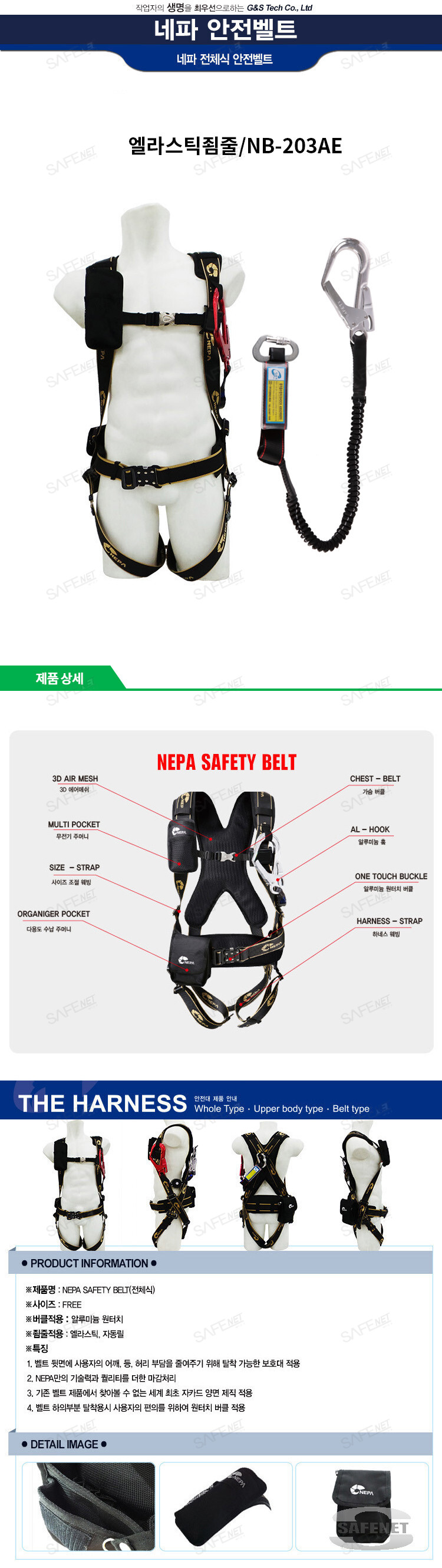 네파 전체식 안전벨트는 알루미늄 원터치 버클을 적용하였으며, 엘라스틱, 자동릴 2가지 죔줄스타일이 있습니다.