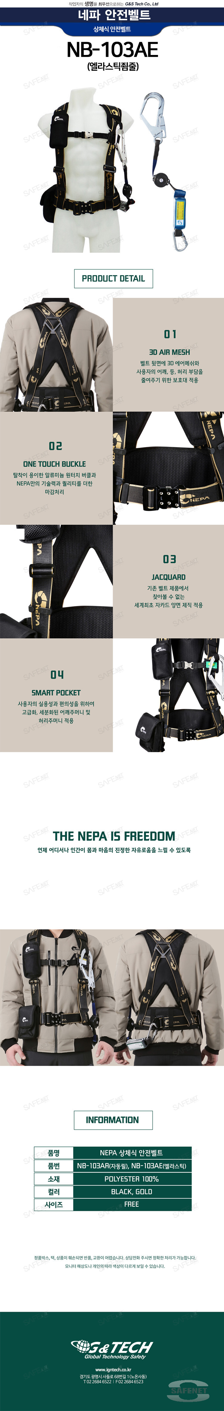 네파 상체식 안전벨트는 알루미늄 원터치 버클을 적용하였으며, 엘라스틱, 자동릴 2가지 죔줄스타일이 있습니다.