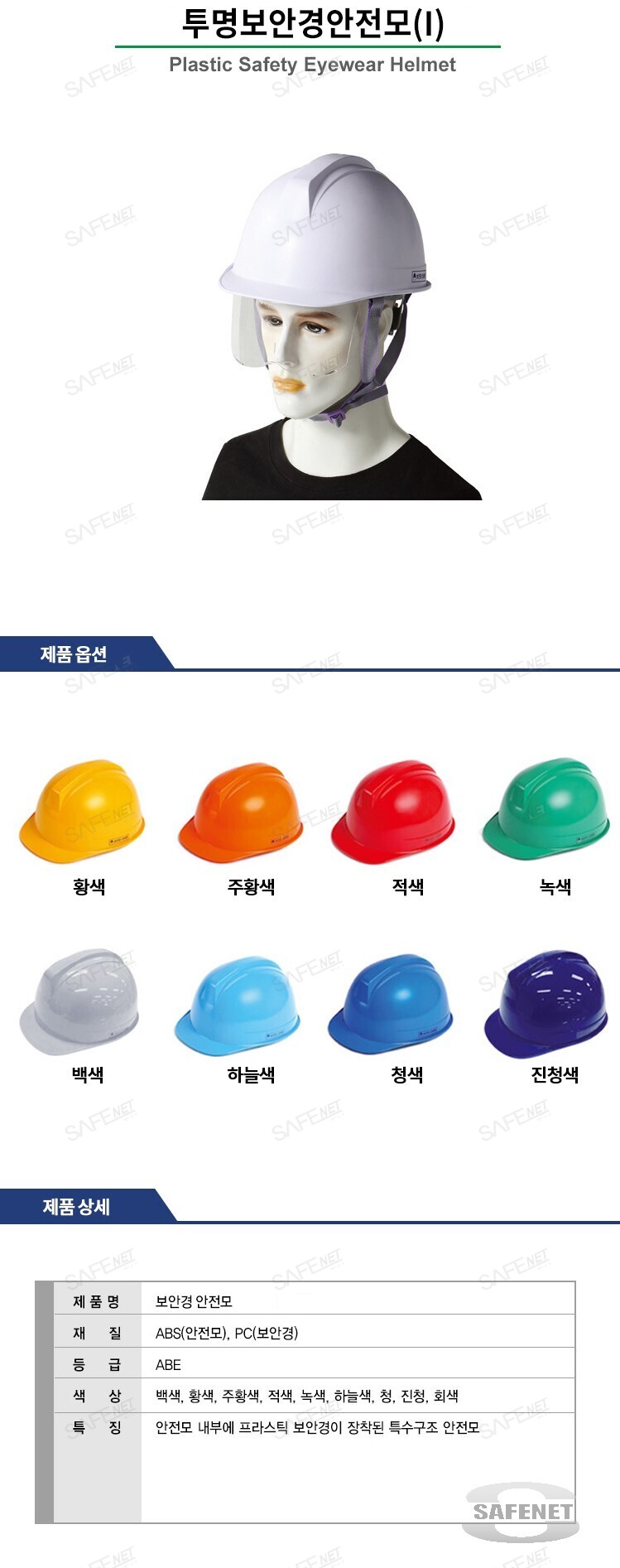 규격 안전모(ABS재질) / 보안경(PC재질) / ABE등급 / 내부에 플라스틱 보안경이 장착된 구조