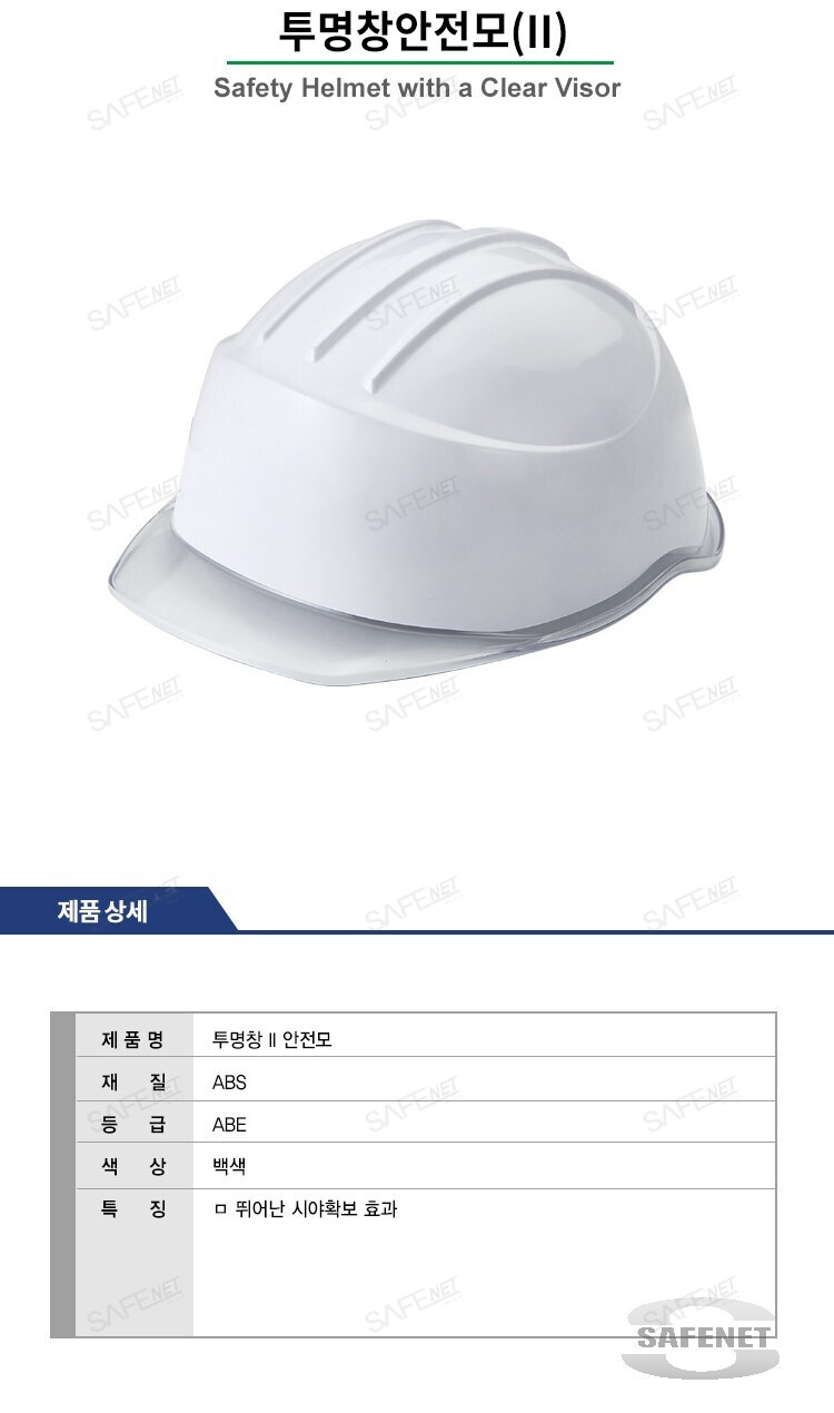규격 ABS재질 / ABE등급 / 헬멧색상-백색 / 창색상-투명 / 뛰어난 시야확보 효과