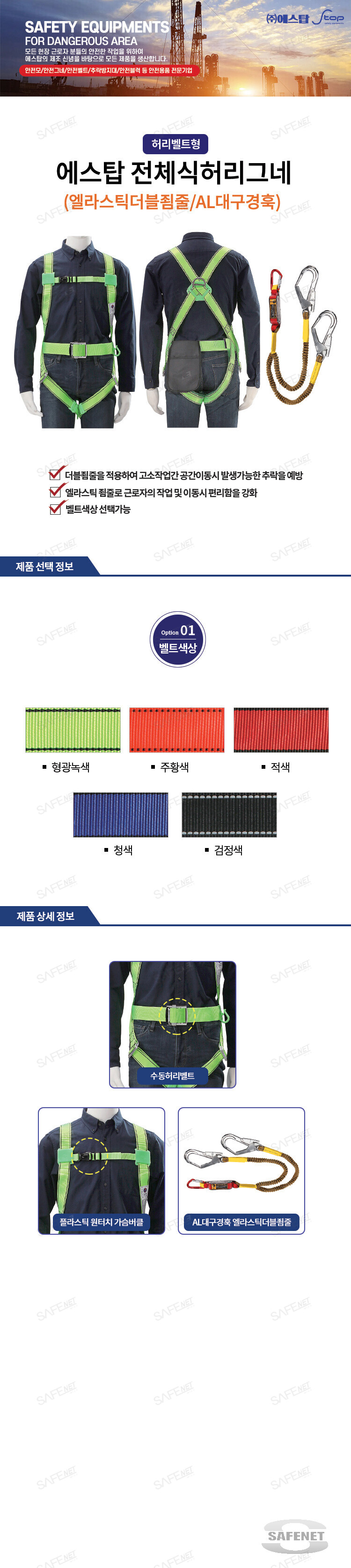 규격 수동허리벨트 / 엘라스틱더블죔줄 / AL대구경훅 / 플라스틱 원터치 가슴버클 / 벨트색상 선택가능