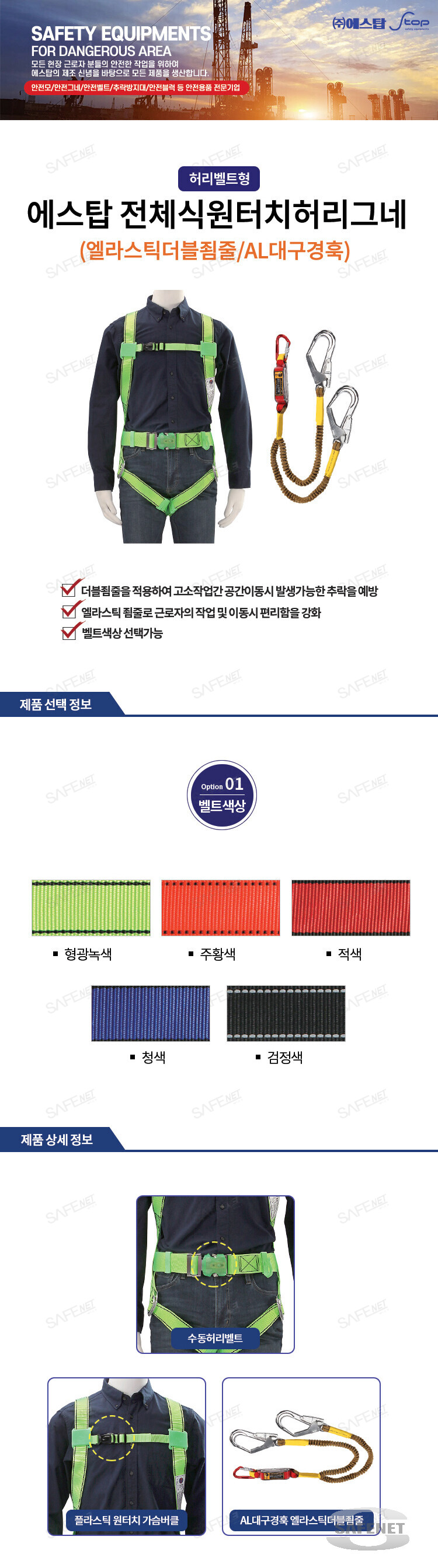 규격 원터치허리벨트 / 엘라스틱더블죔줄 / AL대구경훅 / 플라스틱 원터치 가슴버클 / 벨트색상 선택가능
