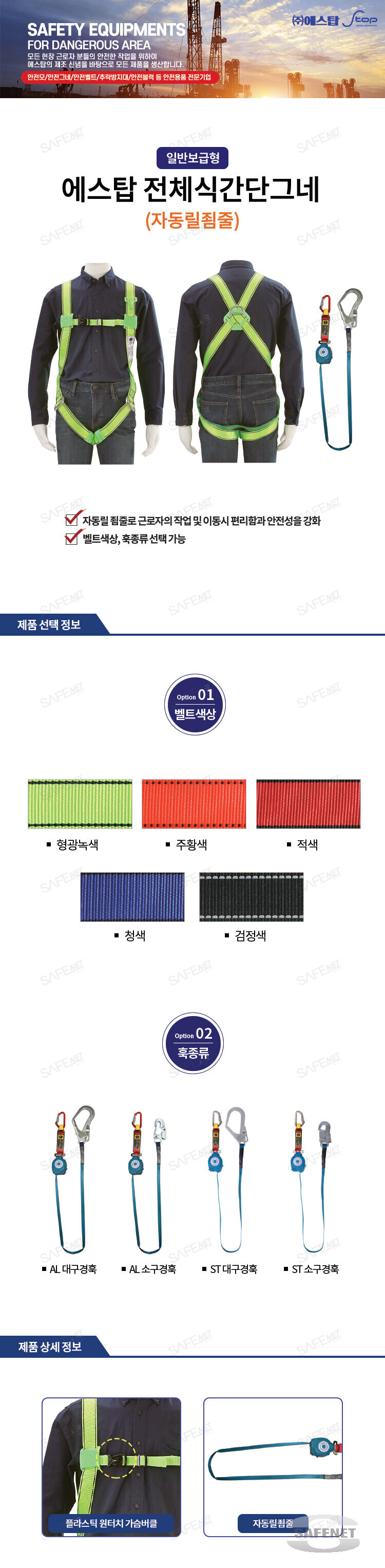 규격 자동릴죔줄 / 플라스틱 원터치 가슴버클 / 벨트색상 선택가능 / 훅종류 선택가능