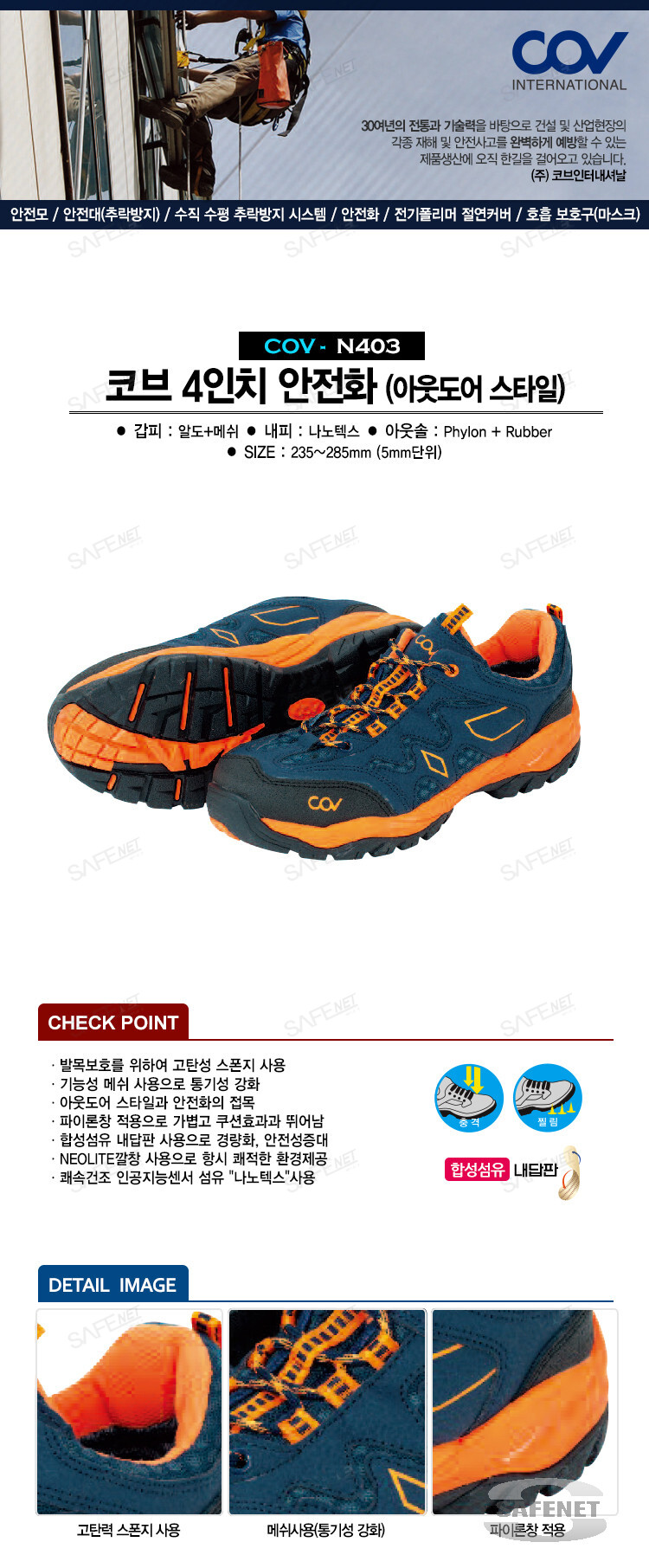 2. 규격 : 아웃도어 스타일 안전화, 4인치 안전화, 나노텍스 섬유 사용, 235mm~285mm (5mm단위)