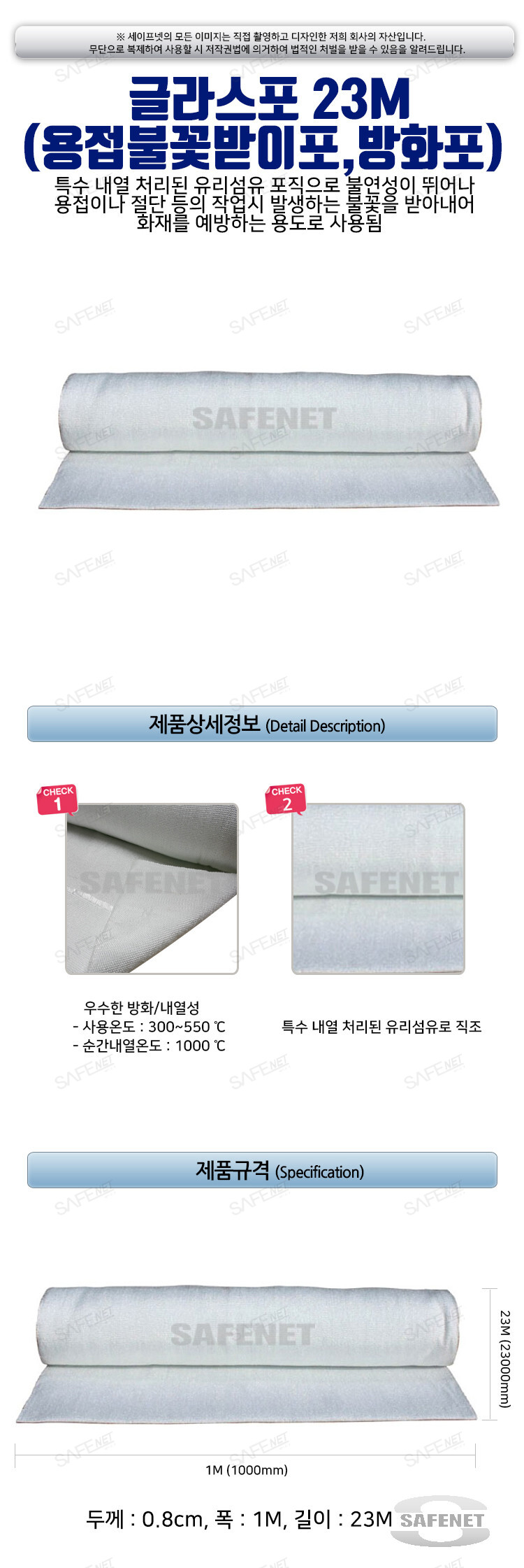 ● 사이즈 : 0.8T X 1M X 23M ● 재질 : 유리섬유 직조 ● 특징 : 용접시트 우수한 방화 내열성 사용온도 450℃~650℃ 단일 비닐포장