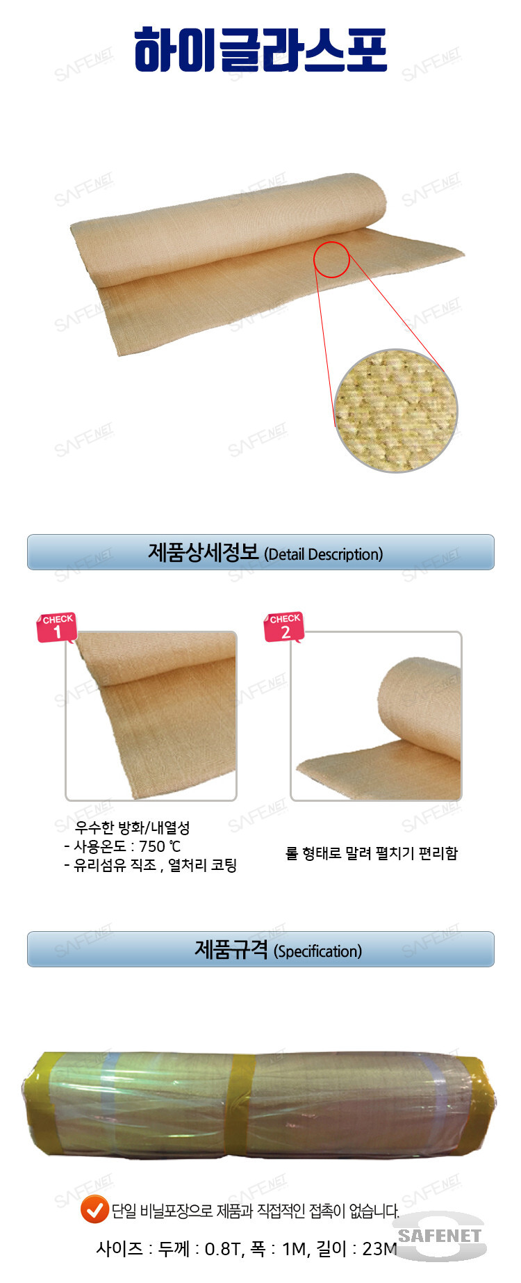 사이즈 : 0.8T X 1M X 23M 재 질 : 유리섬유 직조 , 열처리방식 코팅 특 징 : 용접시트 우수한 방화 내열성 사용온도 750℃ 단일비닐포장