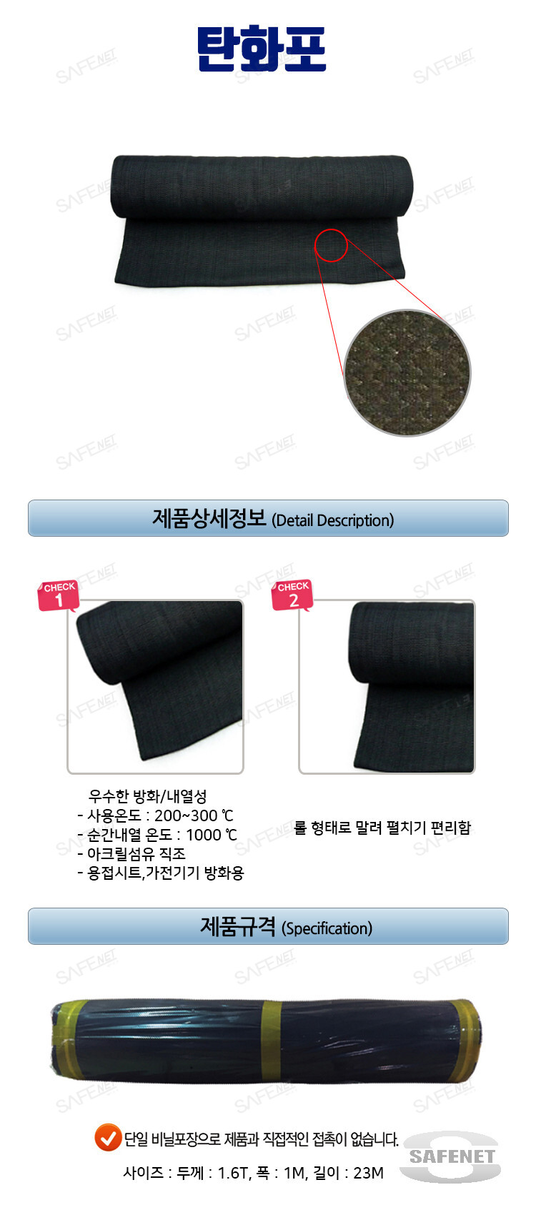 사이즈 : 1.6T X 1M X 23M 재질 : 아크릴섬유 직조 특징 : 용접시트, 가전기기 방화용 사용온도 200℃~300℃ 순간내열 온도 1000℃ 비닐포장으로 단일포장