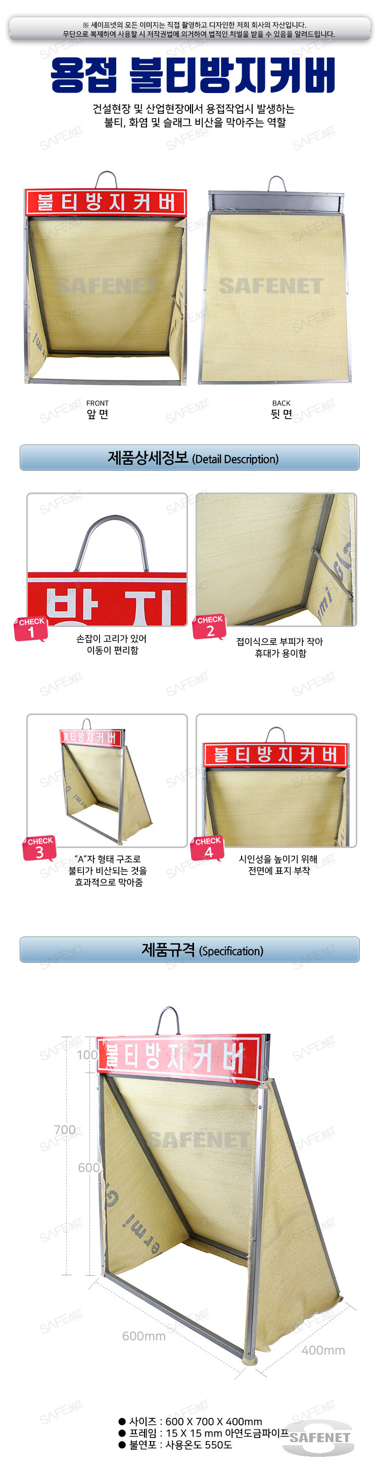 사이즈 : 600 X 700 X 400(mm) 특징 : 버미글라스 재질로 사용온도 550도 용접작업시 발생하는 화염,슬래그비산을 차단 접이식으로 휴대가 용이함.