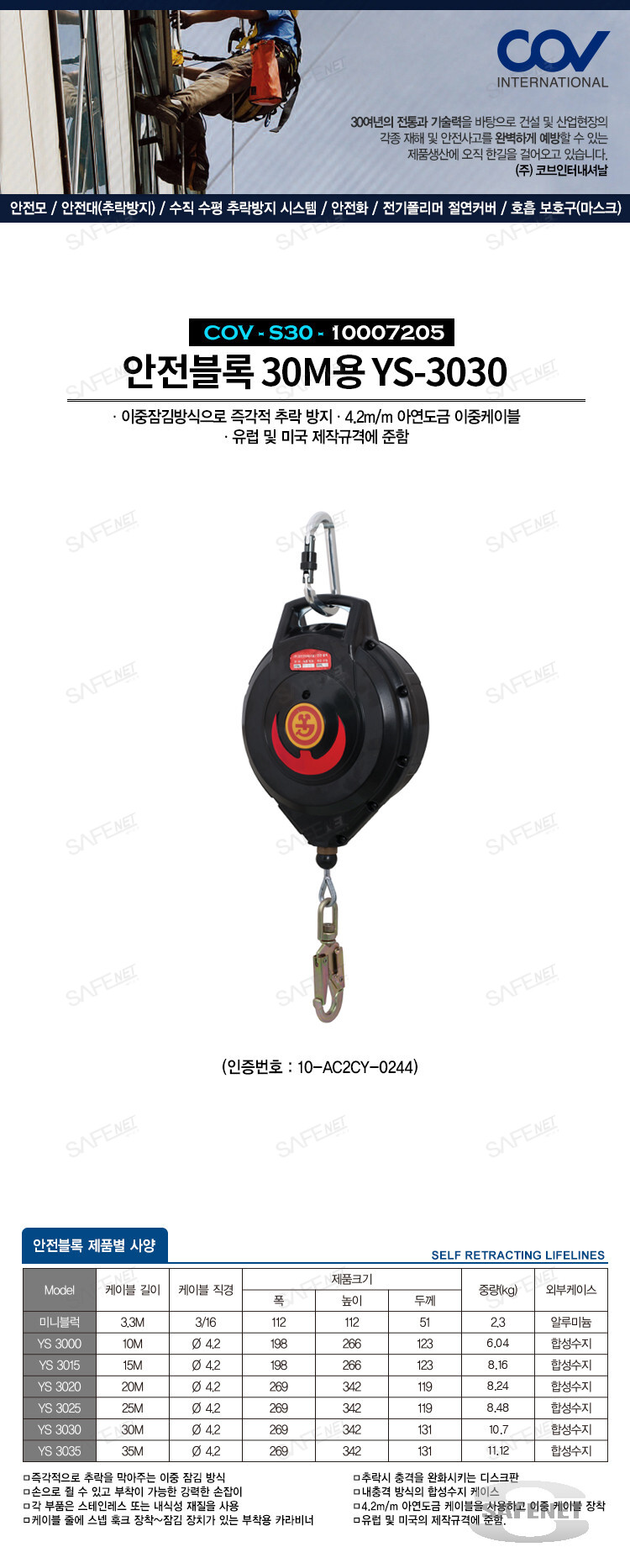 규격 폭269 X 높이342 X 두께131mm / 케이블길이 30M / 중량 10.70kg / 4.2mm 아연도금 케이블 / 내충격 합성수지 케이스