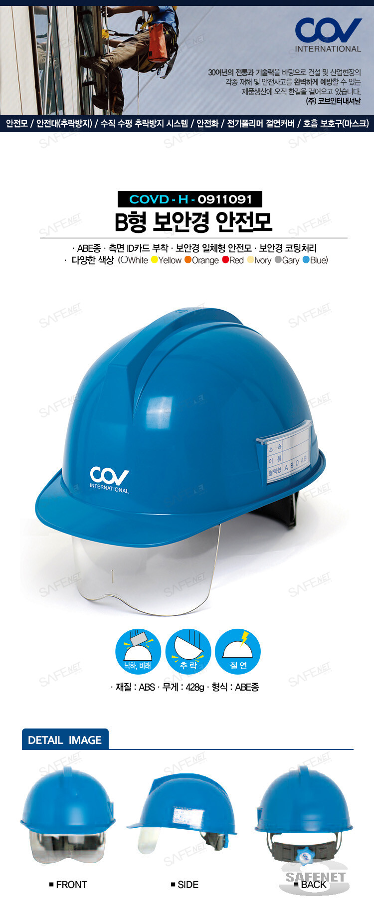 2. 규격 : ABE종, 측면 ID카드 부착, 보안경 일체형 안전모, 다양한 색상, 보안경 코팅처리