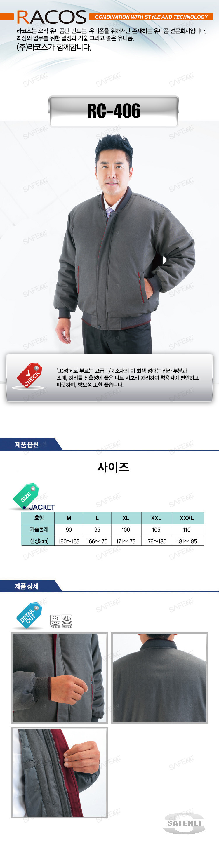 'LG점퍼'로 부르는 고급 T/R 소재의 이 회색 점퍼는 카라 부분과 소매, 허리를 신축성이 좋은 니트 시보리 처리하여 착용감이 편안하고 따뜻하며, 방오성 또한 좋습니다.​