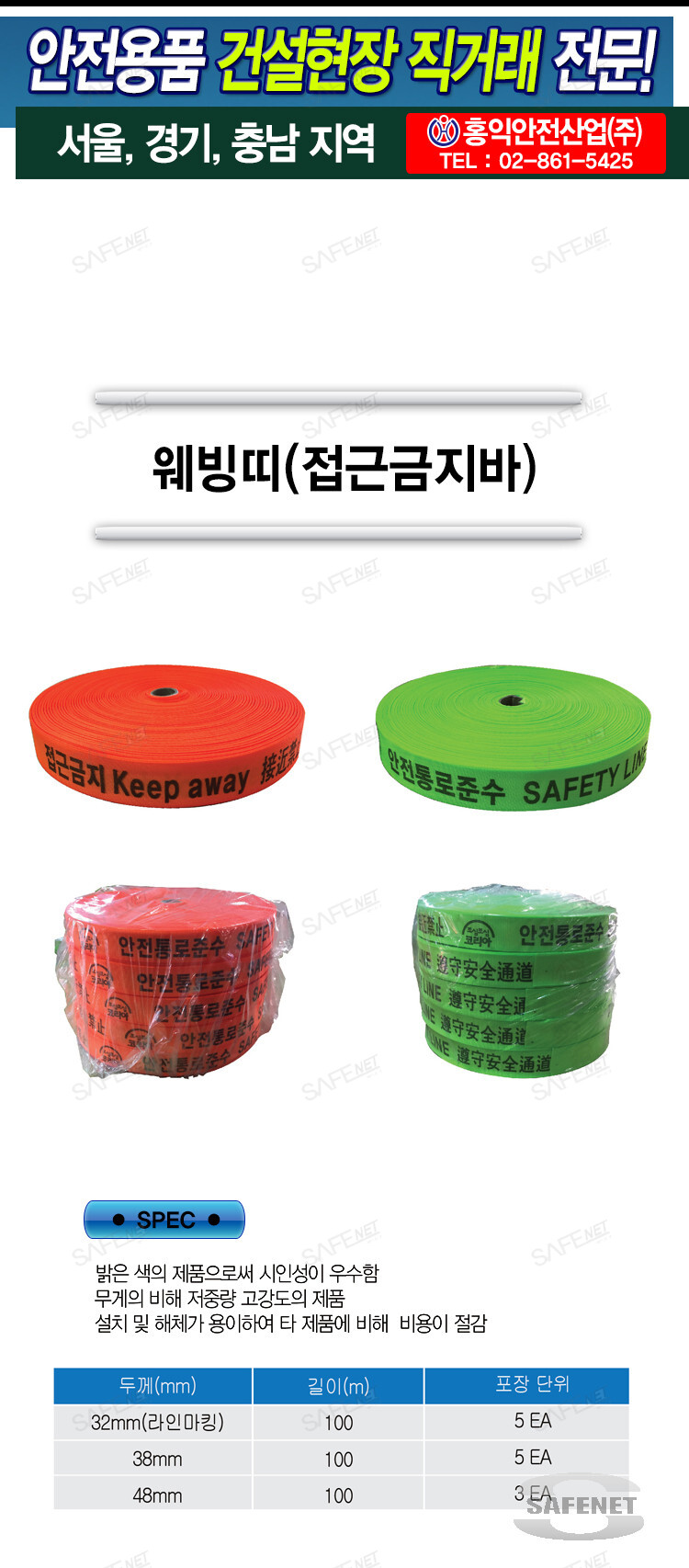웨빙띠 ㅁ사이즈 : 32, 38, 48mm ㅁ특징 : 밝은 색의 제품으로써 시인성이 우수함 무게의 비해 저중량 고강도의 제품 설치 및 해체가 용이하여 타 제품에 비해 비용이 절감