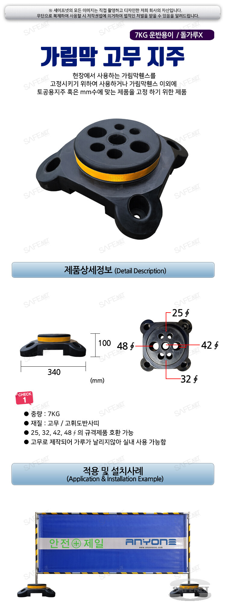 규격 검정색 원형고무지주, 중량 10kg, 25,32,42,48 파이 모두사용가능