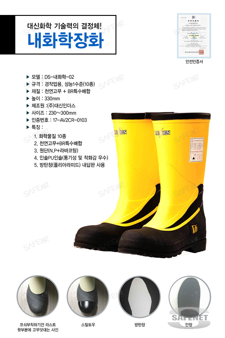 ㅁ 특징 : 화학물질 10종 / 천연고무+BR특수배합 / 원단(N.P+라바코팅) / 인솔PU인솔(통기성 및 착화감 우수) / 방탄창(폴리아라미드) 내답판 사용