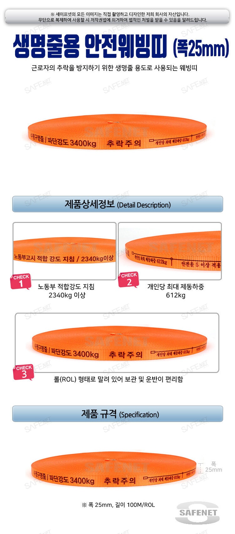 폭 25mm X 100M, 색상 : 주황색, 파단강도 2340kg 이상 |