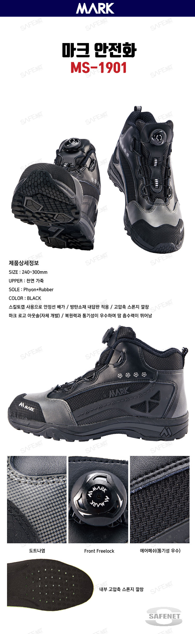 * 스틸토캡 사용으로 안전성 배가, 방탄소재 내답판 적용, 고압축 스폰지 깔창, 마크 로고 아웃솔, 복원력과 통기성이 우수하여 땀 흡수력이 뛰어남