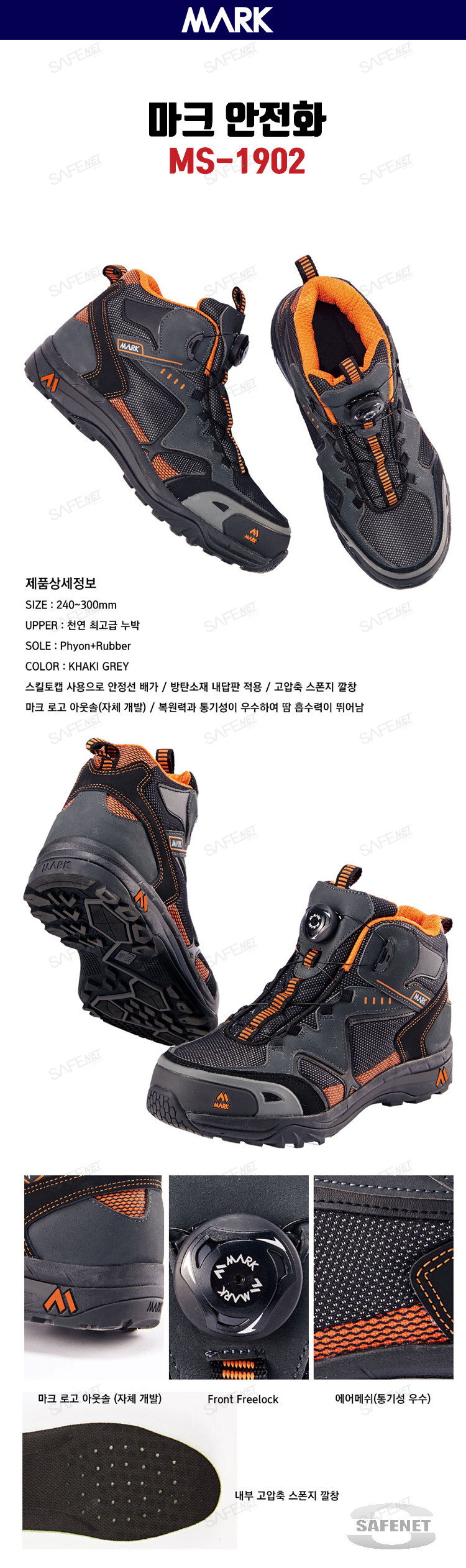 * 스틸토캡 사용으로 안전성 배가, 방탄소재 내답판 적용, 고압축 스폰지 깔창, 마크 로고 아웃솔, 복원력과 통기성이 우수하여 땀 흡수력이 뛰어남