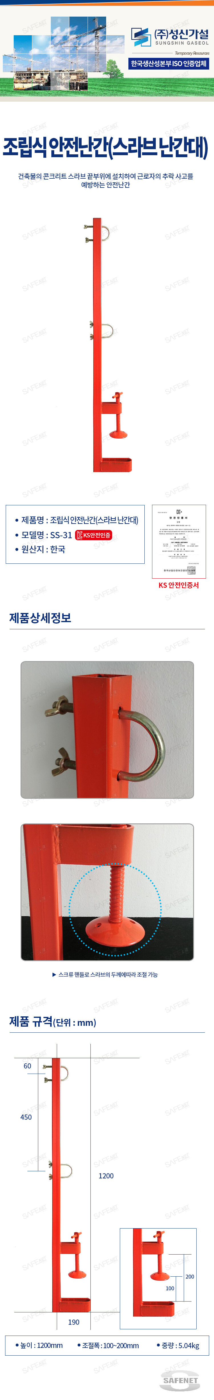 규격 높이 : 1200mm /조절폭 : 100~200mm /중량 : 5.04kg