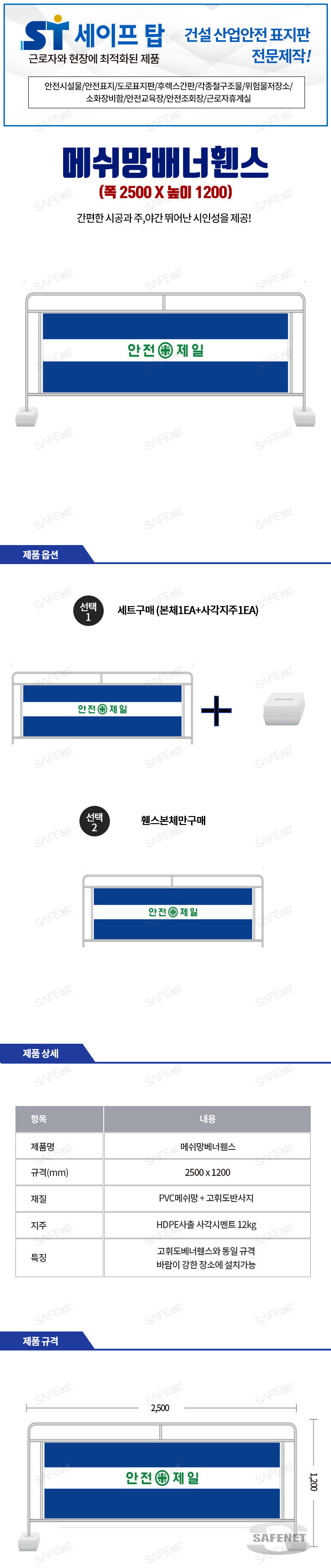 규격 H1200 X W2500mm / 청색메쉬망 / 반사띠 / 안전제일인쇄 / 사각시멘지주