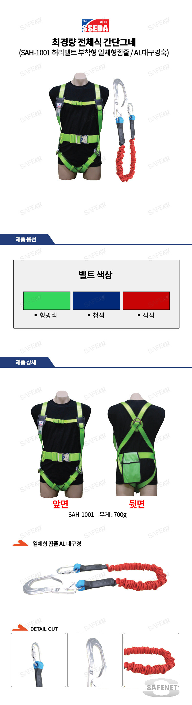 규격 중량 850g / 허리벨트부착형 / 일체형죔줄 / 알미늄대구경훅