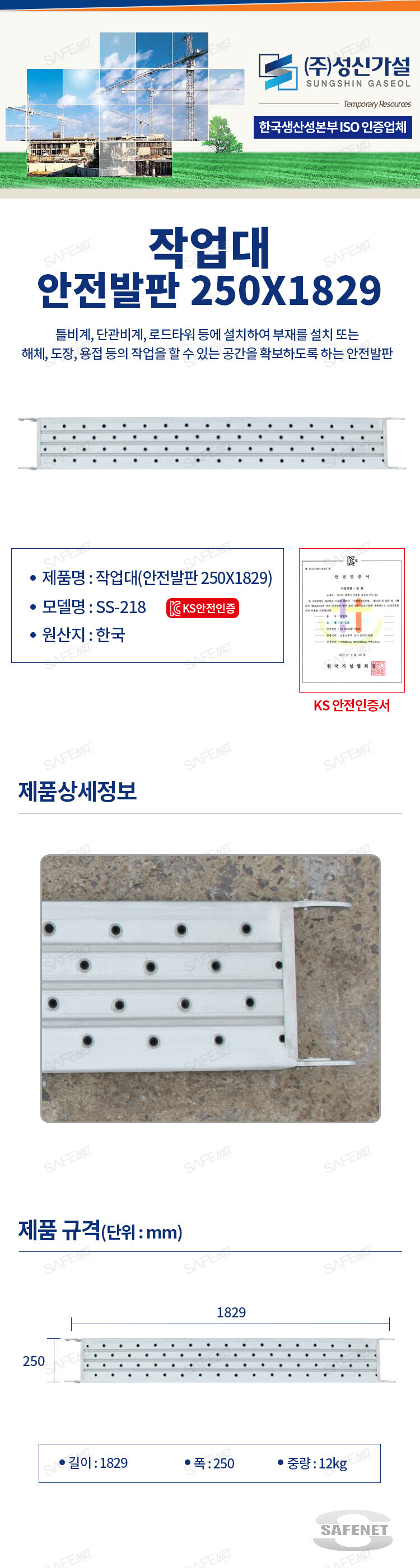 규격 1829 x 250 / 12kg